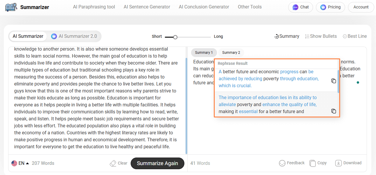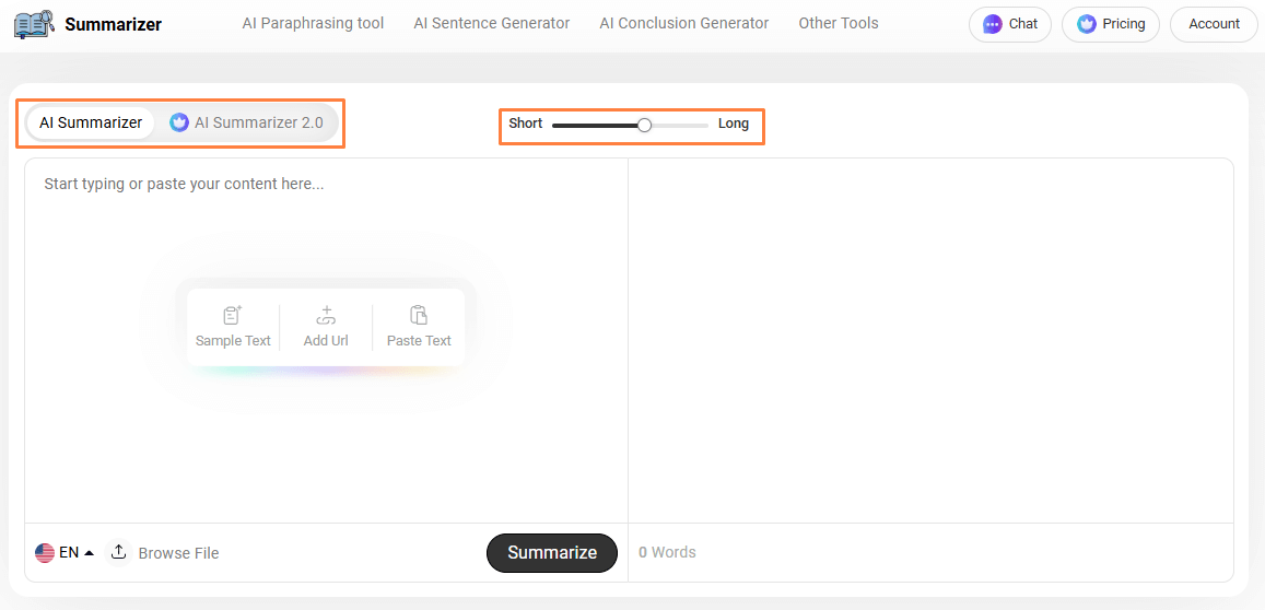The summarizer offers a different option to personalize the summary as per your needs. With the “Slide,” you can customize the summary length between “Short and Long”. Additionally, the AI Summarizer offers two different summarizing modes i.e., AI Summarizer (free) & AI Summarizer 2.0 (premium).