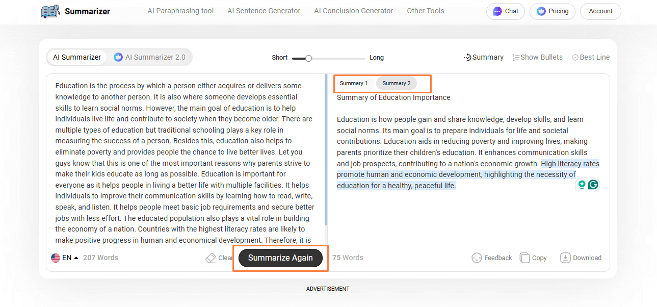 With the AI summarizer, you can generate different summaries around a single input. When you summarize your text, this tool will provide two versions; Summary 1 and Summary 2. If you didn’t like the 1st summary, you can choose the 2nd.